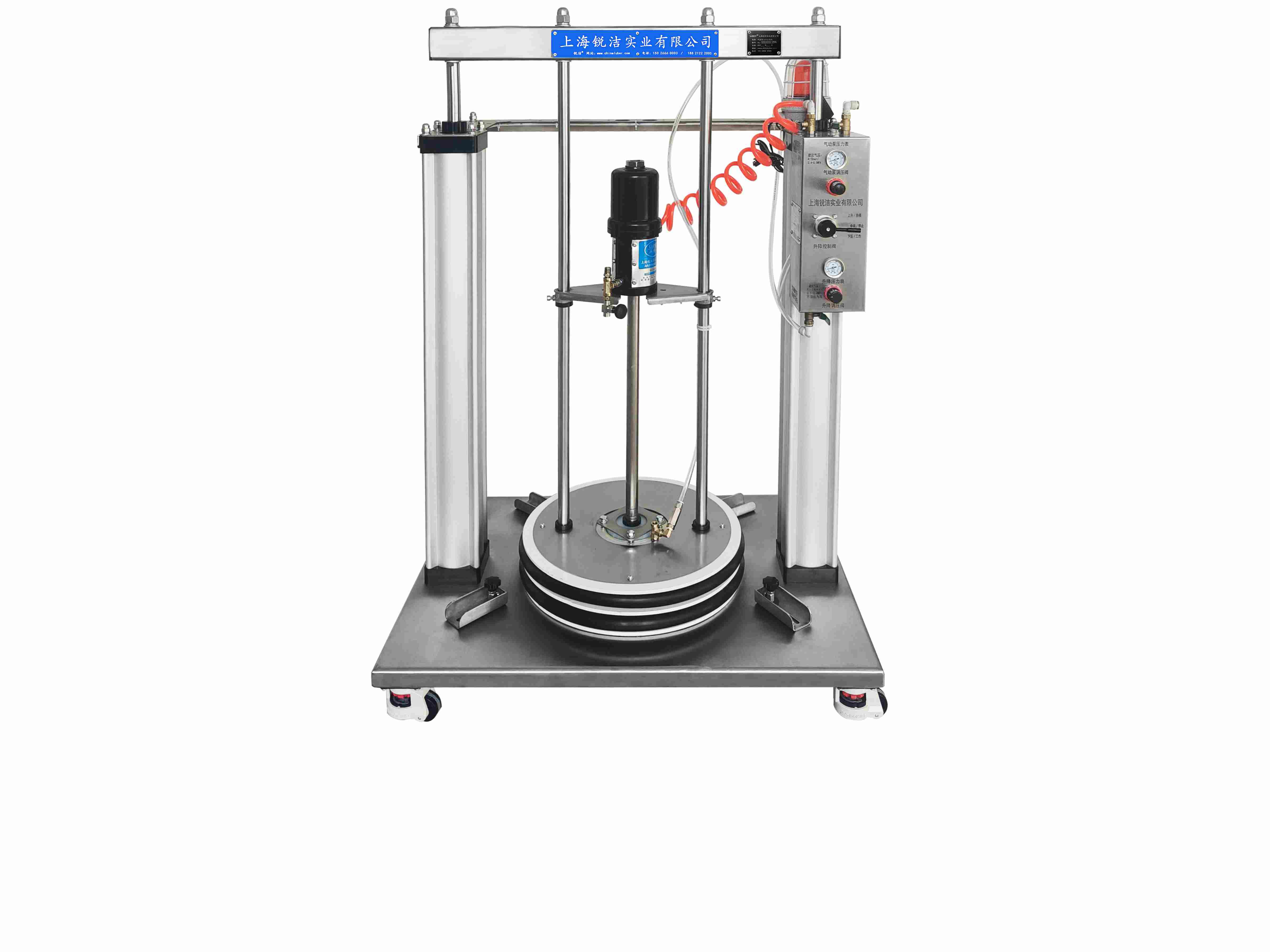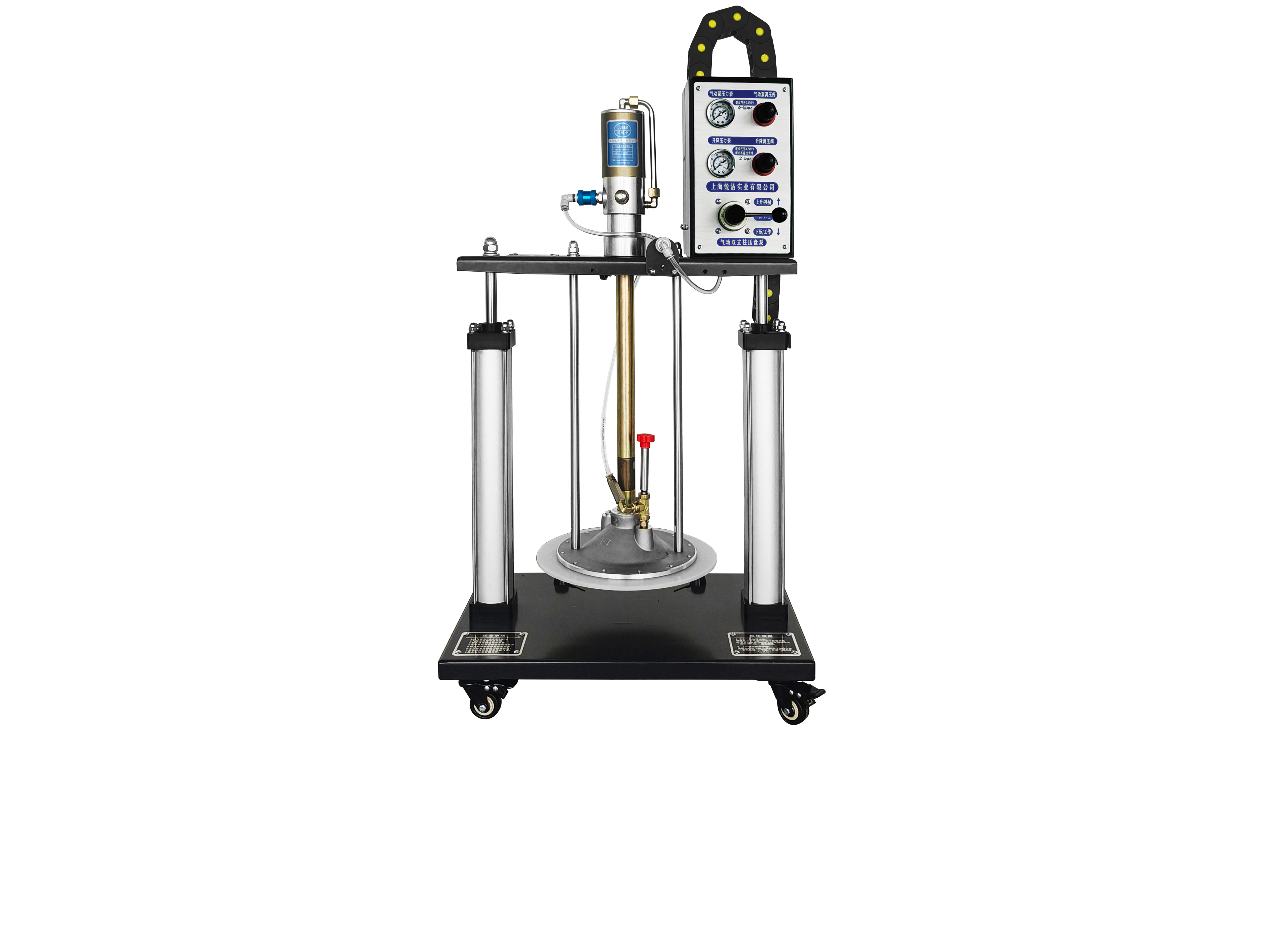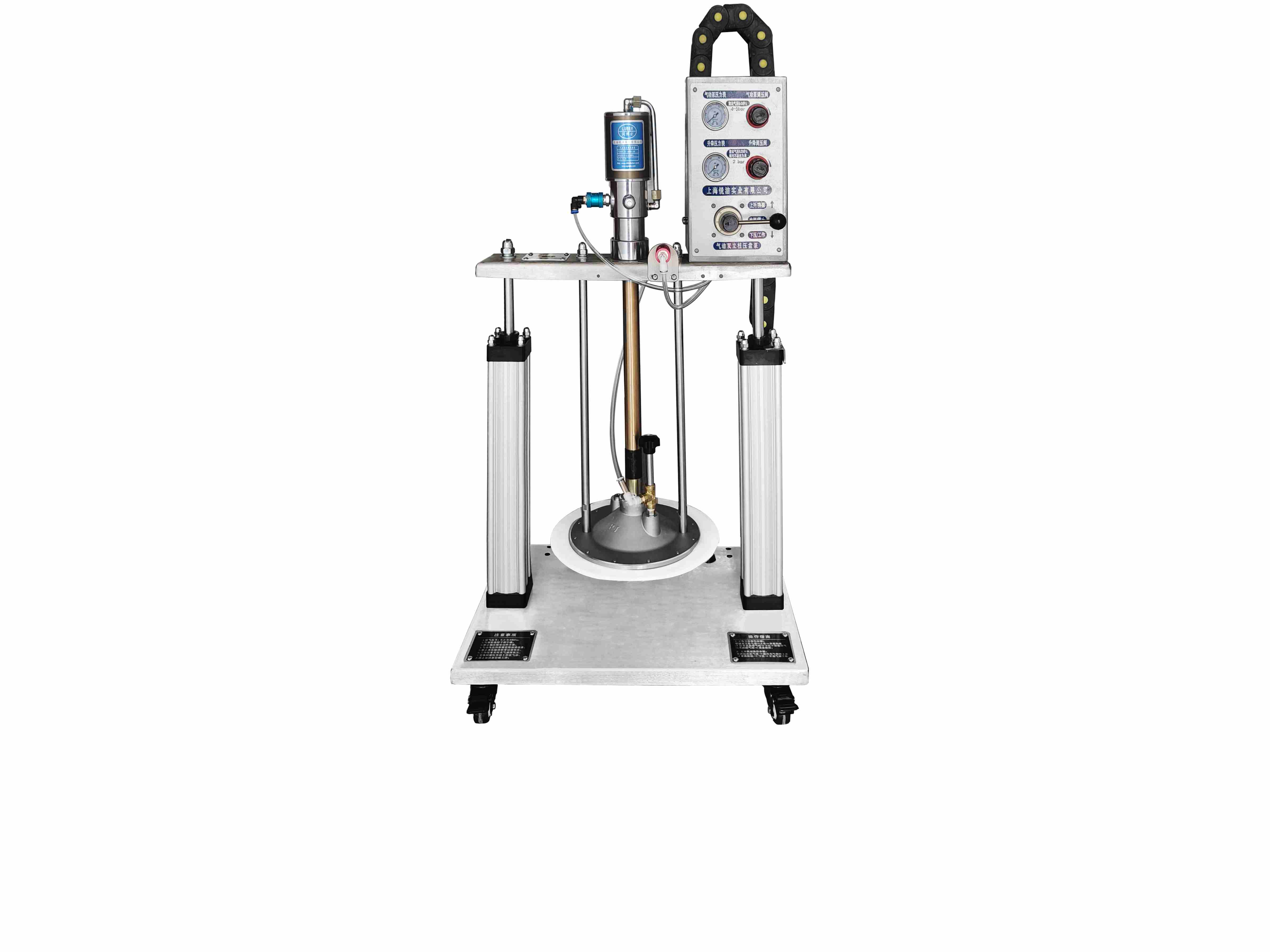 圖示為標準55加侖 170-220kg油脂桶用氣動雙立柱工業注脂機,配氣動工業油脂泵,帶出油排氣閥,有重型雙...